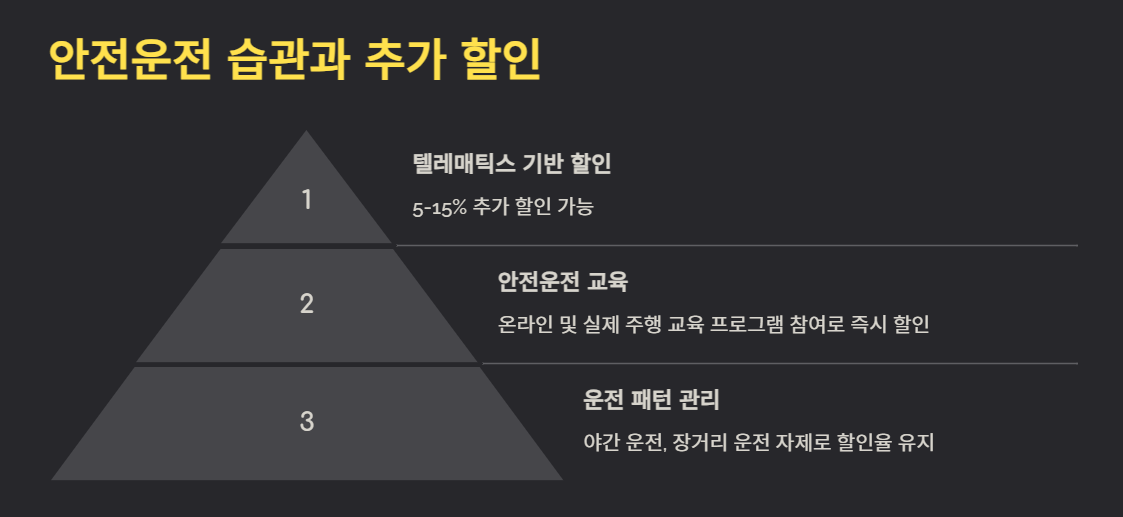 안전운전 습관은 초보 운전자 할인을 유지하고 추가 할인을 받는데 핵심적인 요소입니다. 급가속, 급제동을 피하고 제한속도를 준수하는 등의 기본적인 안전운전 수칙을 지키면, 텔레매틱스 기반 할인을 통해 추가로 5-15%의 할인을 받을 수 있습니다. 대부분의 보험사들은 스마트폰 앱을 통해 운전 습관을 기록하고 분석하여, 안전운전 점수에 따른 차등 할인을 제공하고 있습니다. 특히 출퇴근 시간대의 안전운전은 높은 가점을 받을 수 있는 중요한 평가 요소입니다.