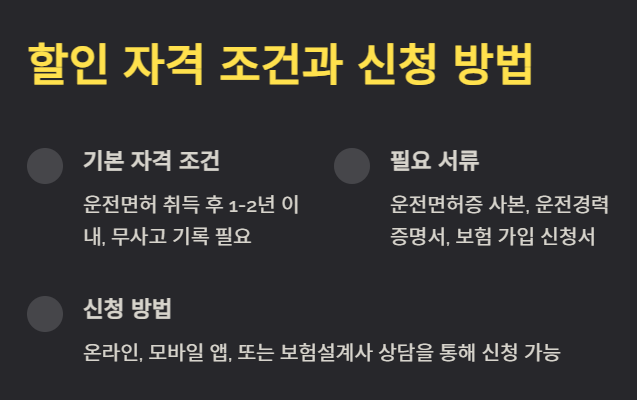 초보 운전자 할인을 받기 위한 기본 자격 조건은 운전면허 취득 후 경과 기간과 무사고 기록입니다. 대부분의 보험사에서는 면허 취득 후 1년 이내의 운전자를 대상으로 하며, 일부 보험사는 이를 2년까지 확대 적용합니다. 할인 신청은 보험 가입 시 면허증과 운전 경력 증명서를 제출하면 되며, 온라인으로도 간편하게 처리할 수 있습니다. 특히 처음 자동차 보험에 가입하는 경우, 보험설계사와의 상담을 통해 자신에게 적용 가능한 모든 할인 항목을 확인하는 것이 좋습니다.