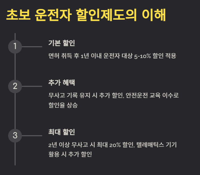 초보 운전자 할인은 운전 경험이 적은 신규 운전자들의 경제적 부담을 덜어주는 중요한 제도입니다. 최근 보험사들은 다양한 할인 프로그램을 통해 초보 운전자들을 지원하고 있으며, 적절한 활용을 통해 보험료를 크게 절감할 수 있습니다. 이 가이드에서는 초보 운전자가 활용할 수 있는 모든 할인 혜택과 신청 방법을 상세히 알아보겠습니다.