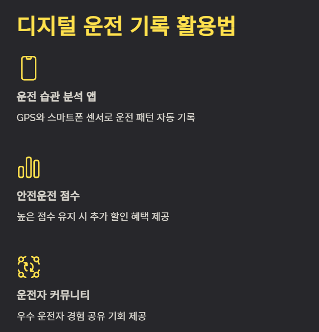 디지털 운전 기록은 보험료 할인뿐만 아니라 안전운전 능력 향상에도 중요한 도구입니다. 초보 운전자들은 자신의 운전 패턴을 객관적으로 분석할 수 있으며, 다른 운전자들과의 비교를 통해 개선점을 파악할 수 있습니다. 일부 보험사는 우수 운전자 커뮤니티를 운영하여 경험 공유의 기회도 제공하고 있습니다. 또한 축적된 운전 데이터는 향후 보험 갱신 시 유리한 조건을 협상하는데 활용할 수 있는 중요한 자료가 됩니다.