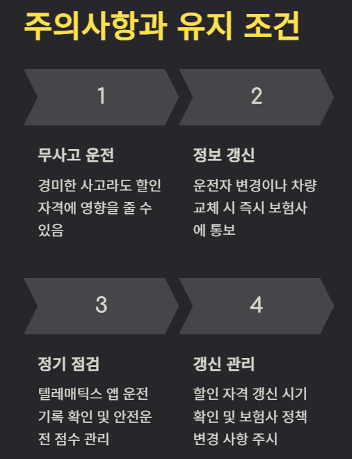 할인 혜택 유지를 위해서는 초보 운전자의 지속적인 관리가 필요합니다. 텔레매틱스 앱을 통한 운전 기록은 정기적으로 확인하고, 안전운전 점수가 떨어지는 패턴이 있다면 즉시 개선해야 합니다. 특히 계절별 운전 조건 변화나 장거리 여행 등 평소와 다른 운전 환경에서는 더욱 주의가 필요합니다. 할인 자격 갱신 시기도 놓치지 않도록 캘린더에 표시해두는 것이 좋으며, 보험사의 정책 변경 사항도 수시로 확인하는 것이 바람직합니다.