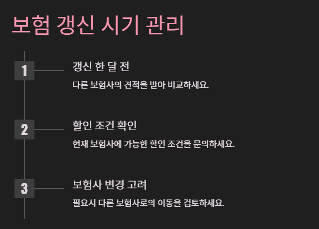 A: 보험료 절약을 위해서는 갱신일 한 달 전부터 여러 보험사의 견적을 비교하는 것이 좋습니다. 견적 비교 시 동일한 보장 내용으로 비교해야 정확한 판단이 가능합니다.