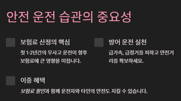 안전 운전은 단순히 사고 예방을 넘어 보험료 절감의 핵심 요소입니다. 보험사들은 운전자의 사고 이력과 교통법규 위반 기록을 면밀히 검토하여 보험료를 책정합니다. 특히 초보 운전자의 경우, 첫 1-2년간의 무사고 운전이 향후 보험료 산정에 매우 중요한 영향을 미칩니다.