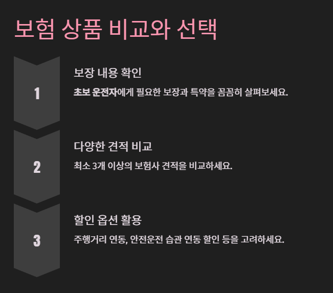 보험 상품 선택 시 단순히 보험료만 비교하는 것은 현명하지 않습니다. 초보 운전자에게 필요한 보장 내용과 특약을 꼼꼼히 살펴보아야 합니다. 여러 보험사의 상품을 비교하고, 각 상품의 장단점을 정확히 파악하는 것이 중요합니다.