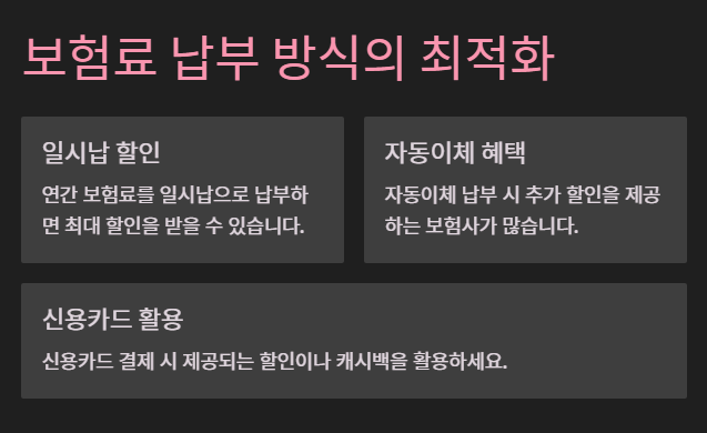 신용카드 결제 시 제공되는 할인이나 캐시백도 활용할 수 있습니다. 단, 초보 운전자의 경우 처음부터 너무 높은 자기부담금을 설정하는 것은 위험할 수 있으니 신중히 결정해야 합니다.