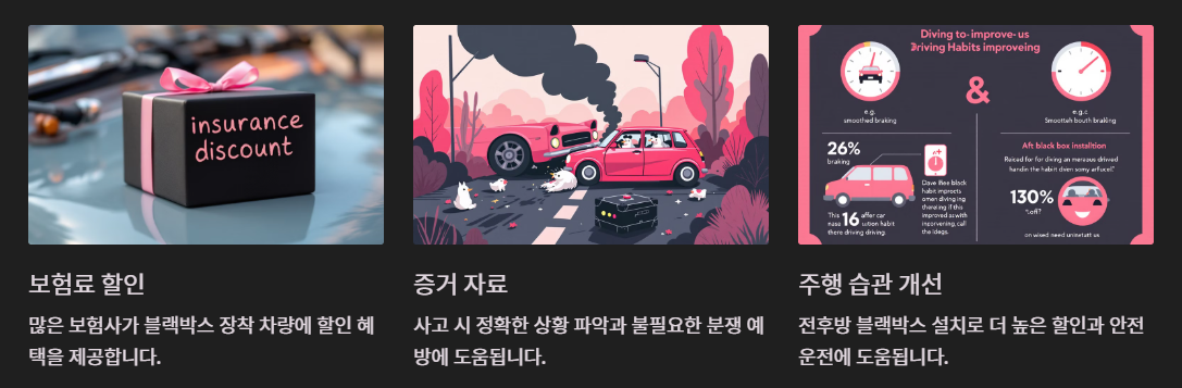 블랙박스 설치는 보험료 절감을 위한 효과적인 투자입니다. 많은 보험사들이 블랙박스 장착 차량에 대해 보험료 할인 혜택을 제공하고 있습니다. 블랙박스는 사고 발생 시 정확한 상황 파악을 가능하게 하여 불필요한 분쟁을 예방할 수 있습니다.