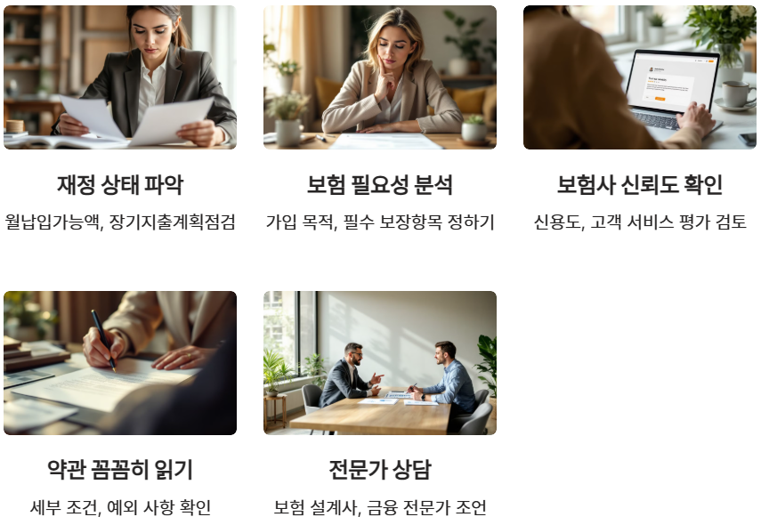 - 보험 필요성 분석: 가입 목적과 필수 보장 항목을 명확히 정하세요.