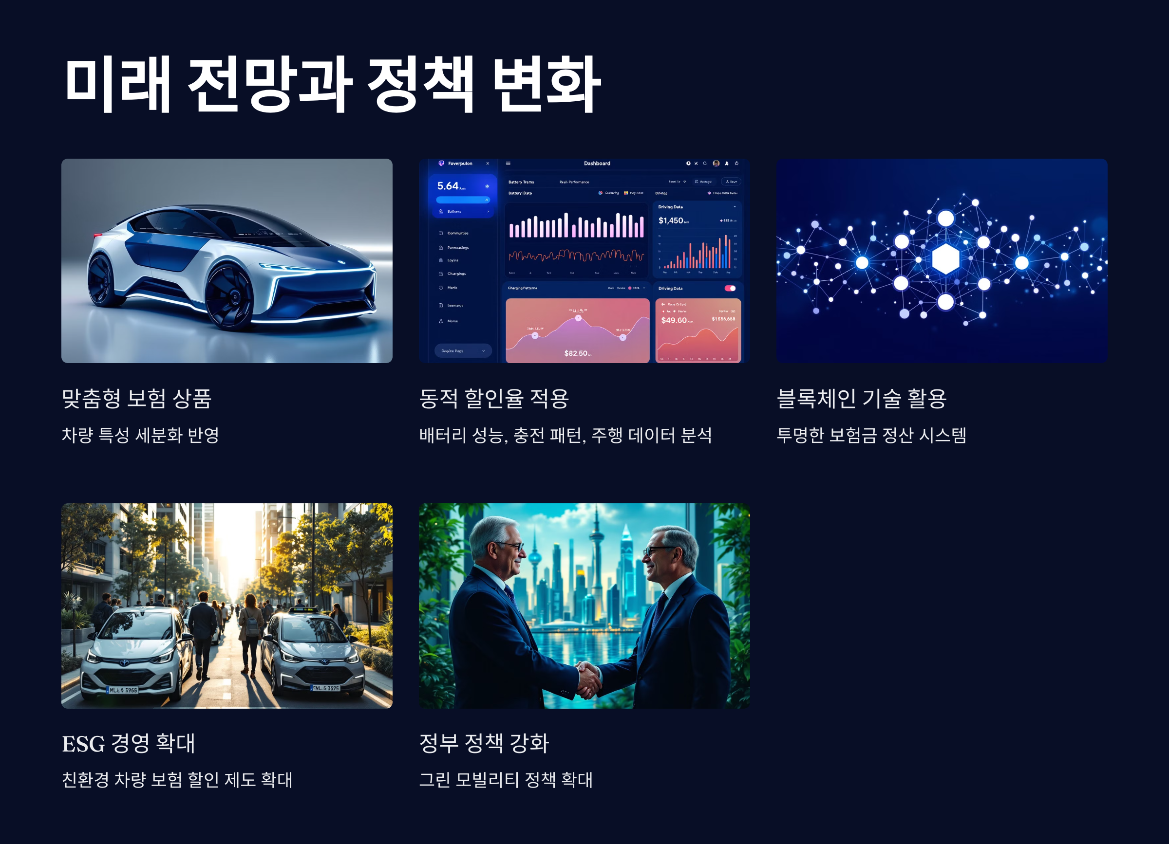 향후에는 친환경 차량의 특성을 더욱 세분화하여 반영한 맞춤형 보험 상품이 등장할 것으로 예상됩니다. 차량의 배터리 성능, 충전 패턴, 주행 데이터 등을 종합적으로 분석한 동적 할인율 적용이 가능해질 것이며, 블록체인 기술을 활용한 투명한 보험금 정산 시스템도 도입될 전망입니다. 글로벌 기후변화 대응 정책의 강화로 인해 친환경 차량에 대한 보험 혜택은 더욱 확대될 것으로 전망됩니다.