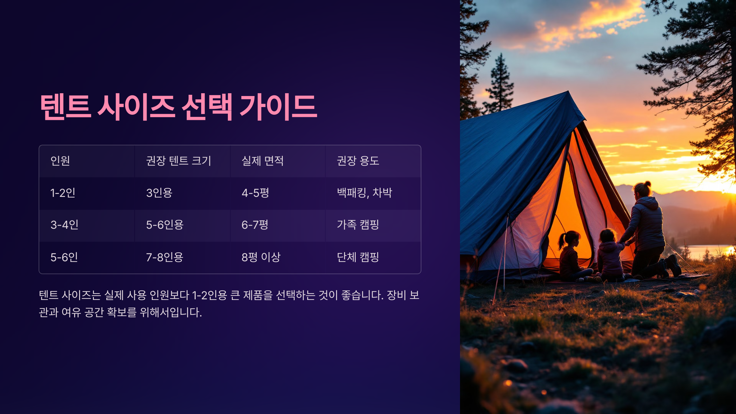 텐트 사이즈는 실제 사용 인원보다 1-2인용 큰 제품을 선택하는 것이 좋습니다. 이는 캠핑 장비를 보관할 공간과 여유 있는 활동 공간을 확보하기 위해서입니다. 특히 장기 캠핑을 계획하고 있다면 더욱 넉넉한 사이즈를 고려해야 합니다.