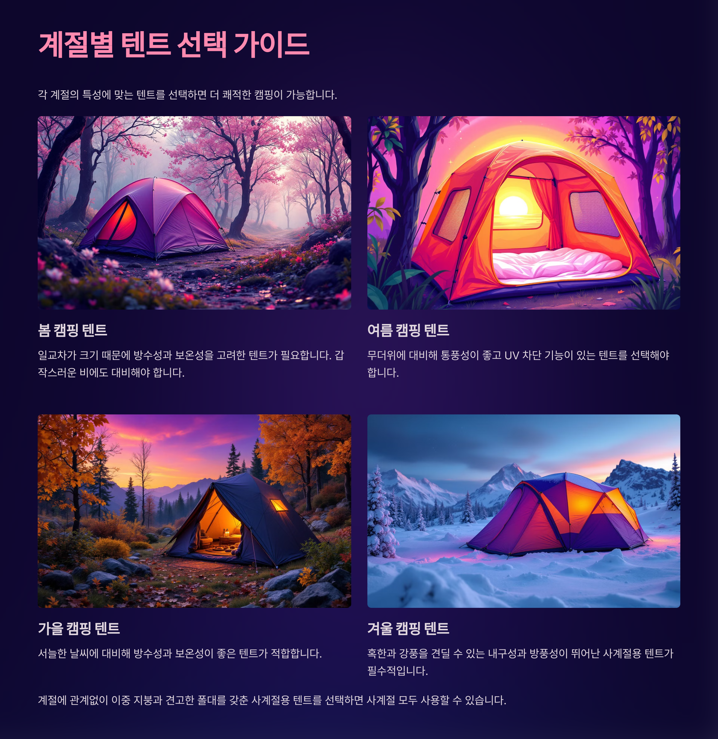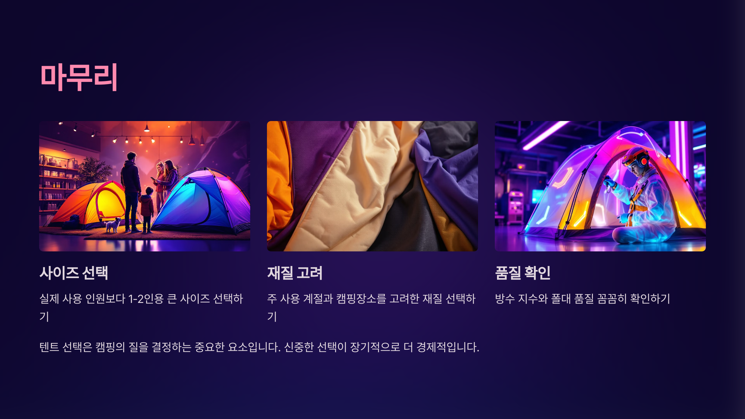 텐트 선택은 캠핑의 질을 결정하는 중요한 요소입니다. 사용 인원, 캠핑 스타일, 계절적 요건을 고려하여 신중하게 선택해야 합니다. 초기 비용이 부담되더라도 튼튼하고 신뢰할 수 있는 브랜드의 제품을 선택하는 것이 장기적으로는 더 경제적입니다.