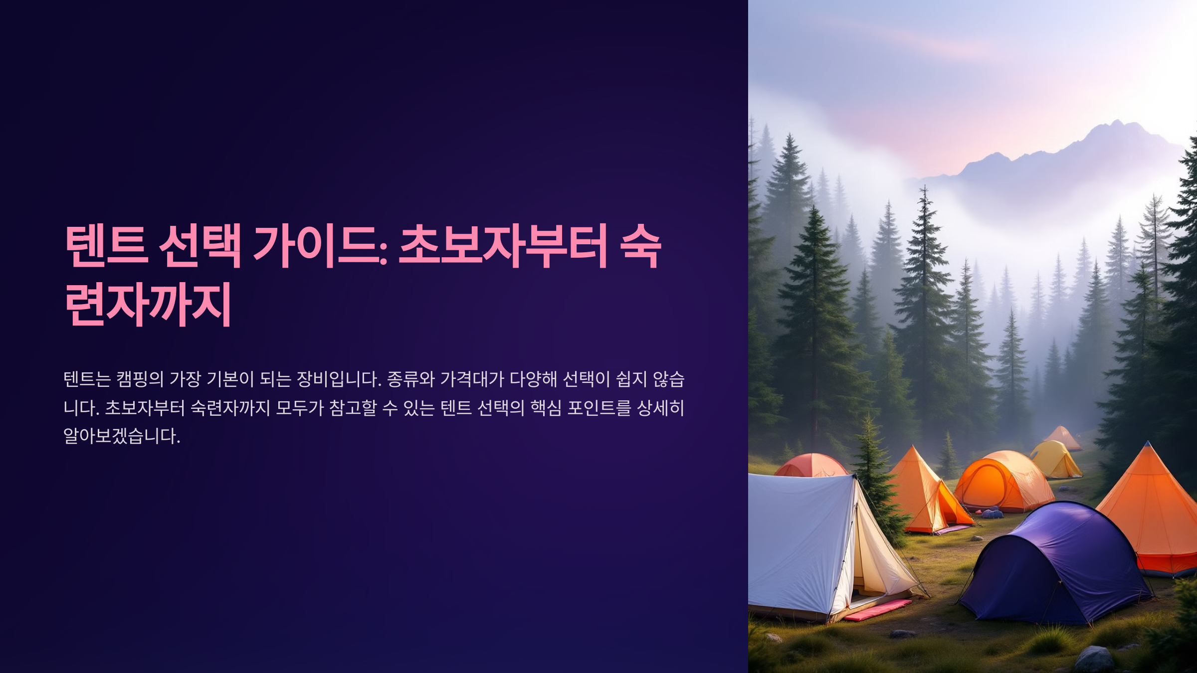 텐트는 캠핑의 가장 기본이 되는 장비입니다. 하지만 종류도 많고 가격대도 천차만별이라 선택이 쉽지 않죠. 초보자부터 숙련자까지 모두가 참고할 수 있는 텐트 선택의 핵심 포인트를 상세히 알아보겠습니다.