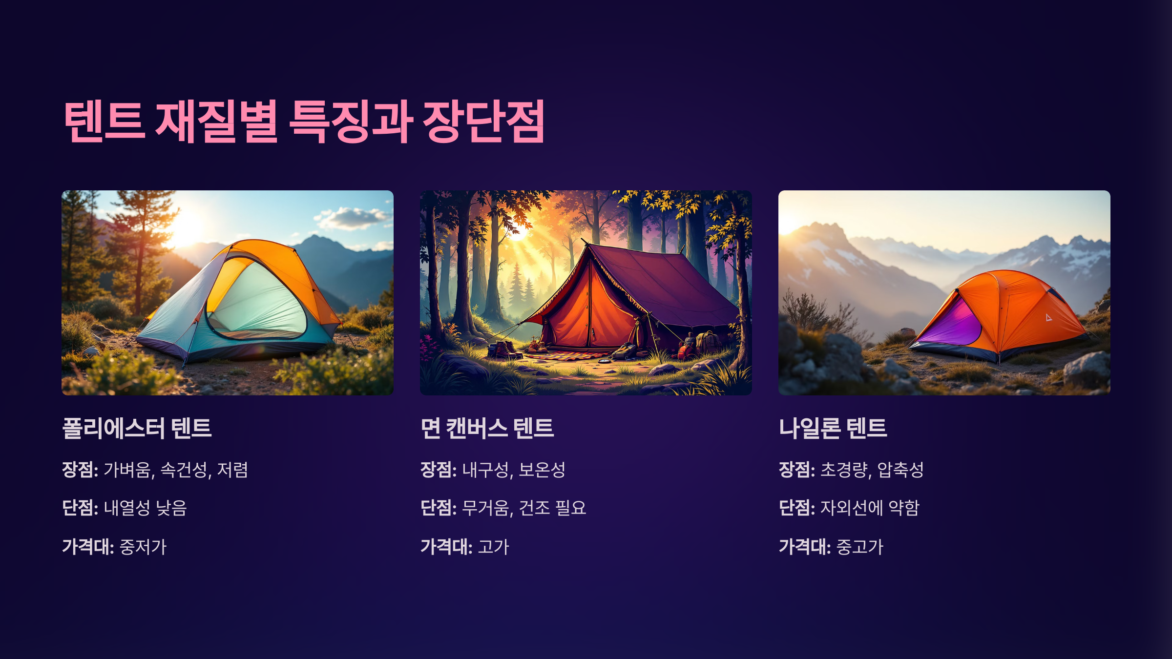 텐트 원단의 선택은 캠핑의 성패를 좌우할 만큼 중요합니다. 폴리에스터는 가벼우면서도 내구성이 좋아 초보자에게 적합하고, 면 캔버스는 보온성과 통기성이 뛰어나 사계절 캠핑에 이상적입니다. 나일론은 초경량을 추구하는 백패커들에게 인기가 높습니다.