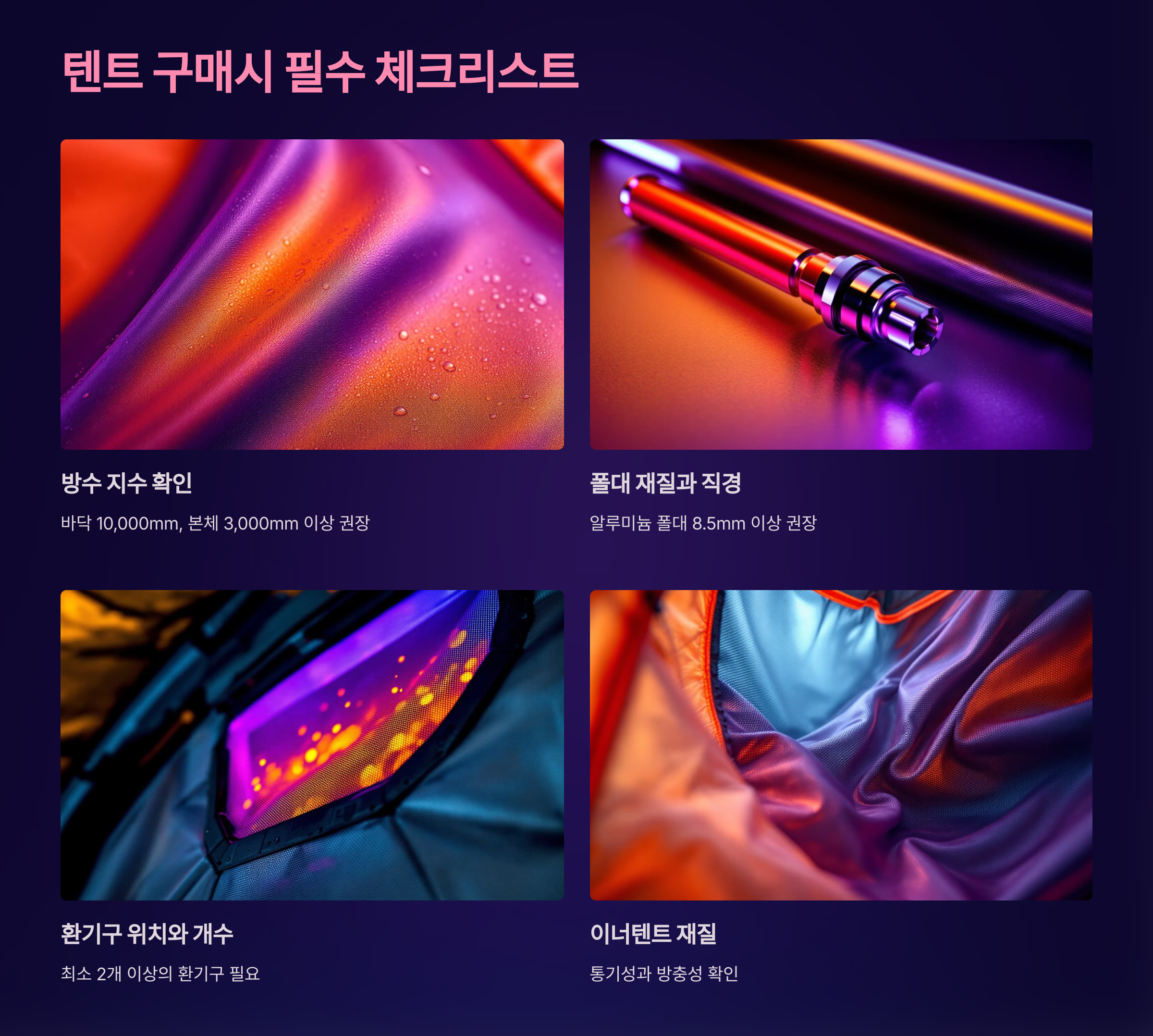 텐트는 캠핑의 기본이 되는 장비이므로 신중한 선택이 필요합니다. 주요 체크포인트를 확인하고 구매하면 실패 없는 선택이 가능합니다. 특히 방수 지수와 폴대 재질은 텐트의 품질을 결정하는 중요한 요소입니다.
