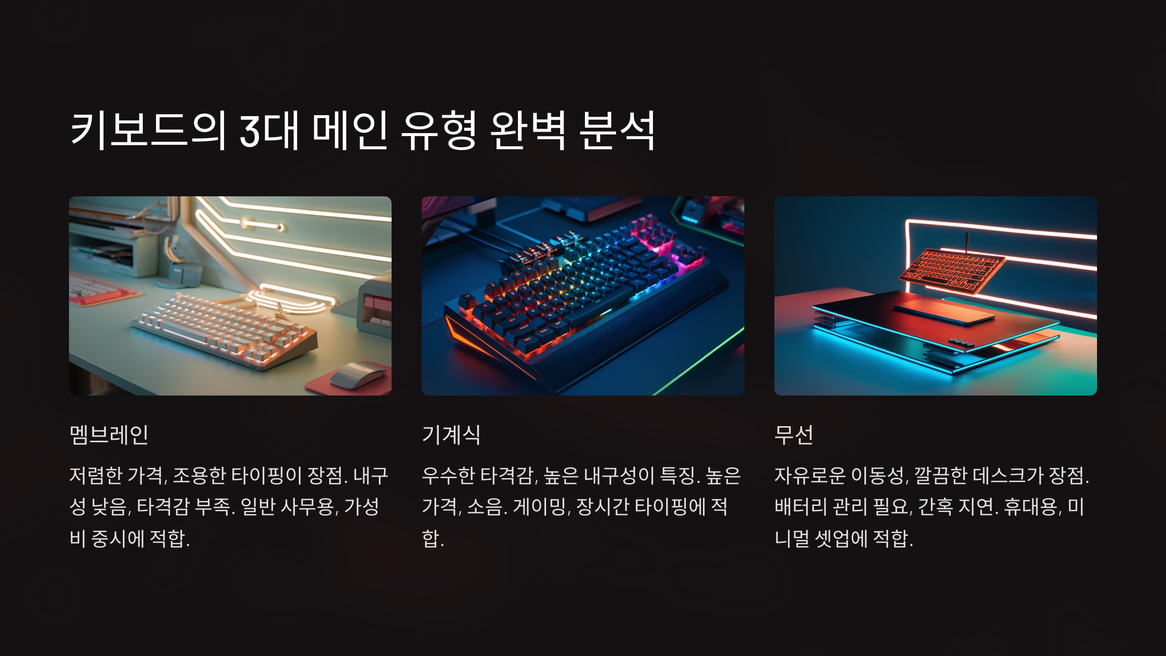 | 멤브레인 | 저렴한 가격, 조용한 타이핑 | 내구성 낮음, 타격감 부족 | 일반 사무용, 가성비 중시 |