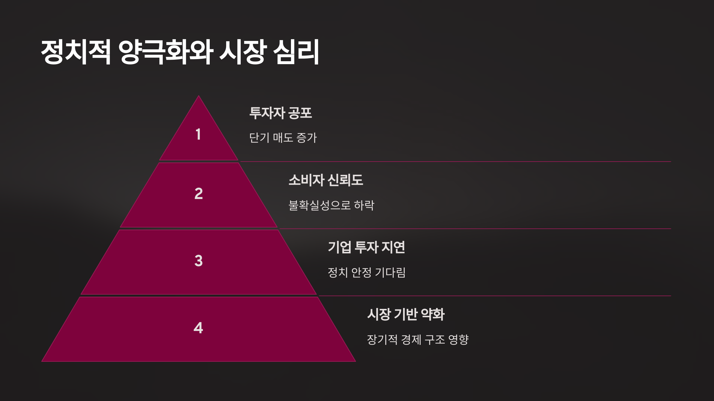 투자 결정에서 가장 기피되는 요소는 불확실성입니다. 정치권 내 양극화가 심화될수록 경제 정책의 방향성과 지속가능성에 대한 의구심이 커지고, 이는 투자자들의 관망세로 이어집니다. 특히 중장년층 투자자들의 경우, 정치적 불안정성이 높을 때 현금 보유 비중을 높이는 경향이 두드러집니다.