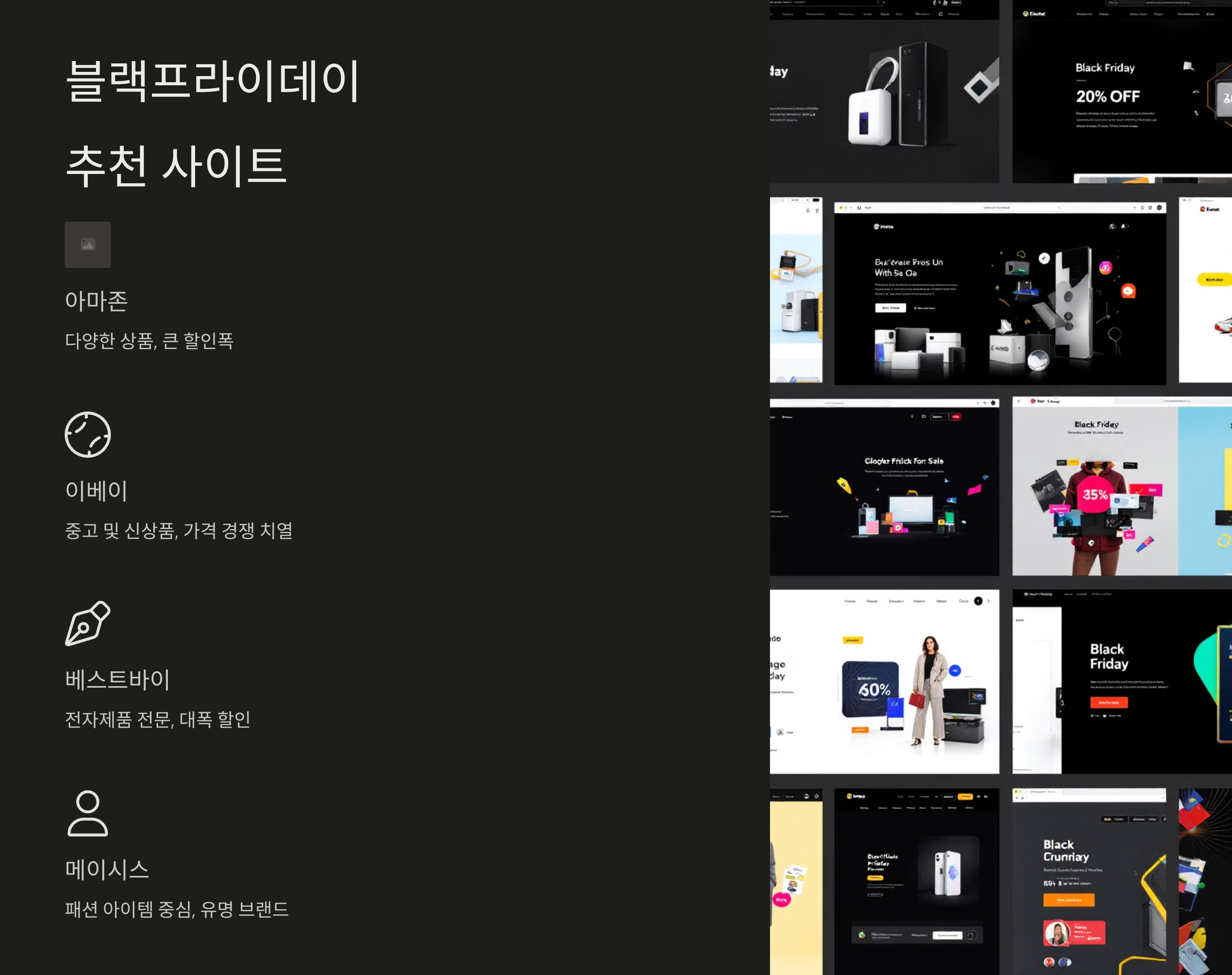 미국 최대의 온라인 쇼핑몰로, 전자제품, 의류, 도서, 생활용품 등 다양한 상품을 취급합니다. 블랙프라이데이 할인 폭이 크며, 간편한 결제 시스템이 장점입니다.