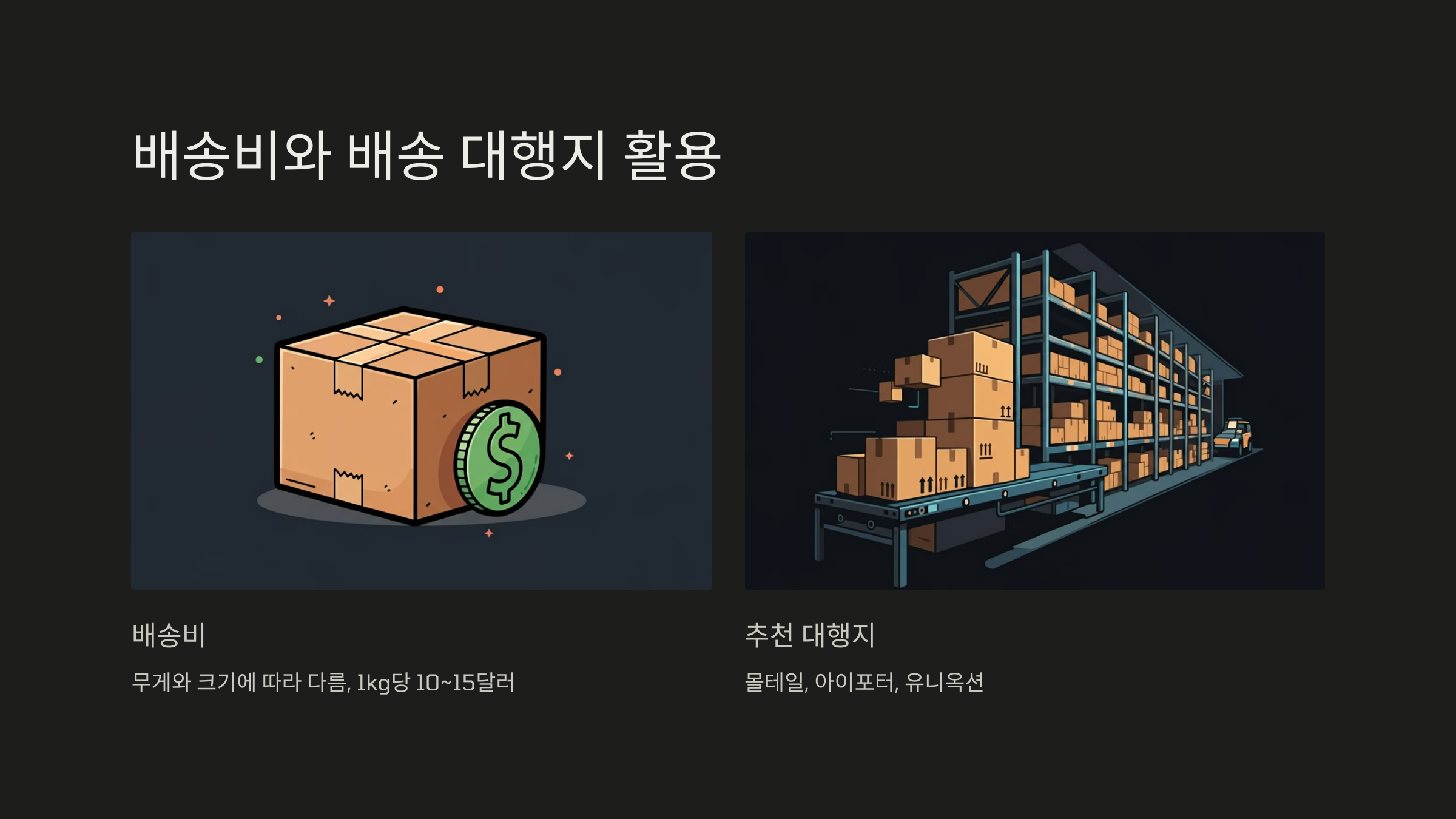 배송비는 제품의 무게와 크기에 따라 다르며, 배송 대행 서비스를 사용할 때 추가 비용이 발생할 수 있습니다. 일반적으로 1kg 당 10~15달러 수준이며, 상품 수령지와 무게에 따라 비용이 크게 달라질 수 있습니다.