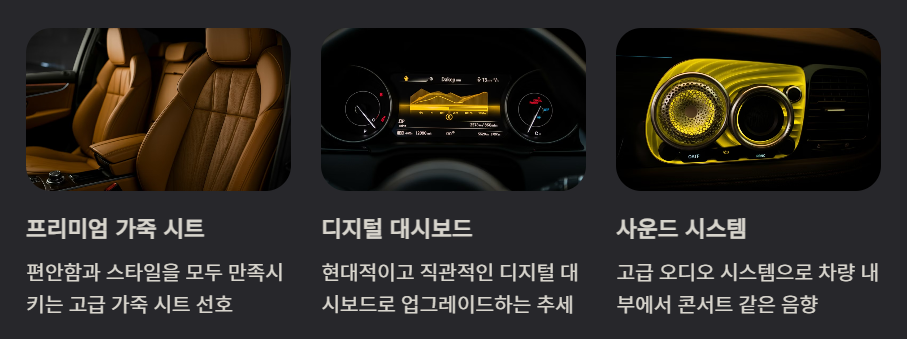 - 프리미엄 가죽 시트: 고급 가죽 시트는 편안함과 스타일을 모두 만족시키는 요소로, 많은 운전자들이 선호하는 튜닝입니다. 색상과 질감도 다양하게 선택할 수 있어 개인의 취향을 반영할 수 있습니다.
