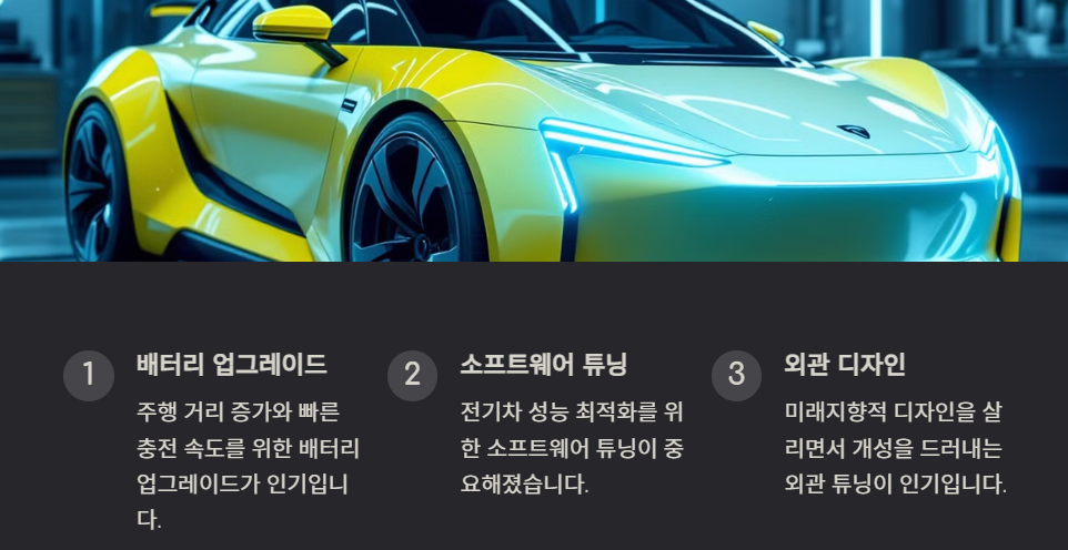 - 외관 디자인: 전기차 특유의 미래지향적인 디자인을 살리면서도, 개성을 드러낼 수 있는 외관 튜닝이 인기를 끌고 있습니다. 특히, 공기역학적 디자인을 유지하면서도 스타일을 살리는 방식이 많이 사용되고 있습니다.