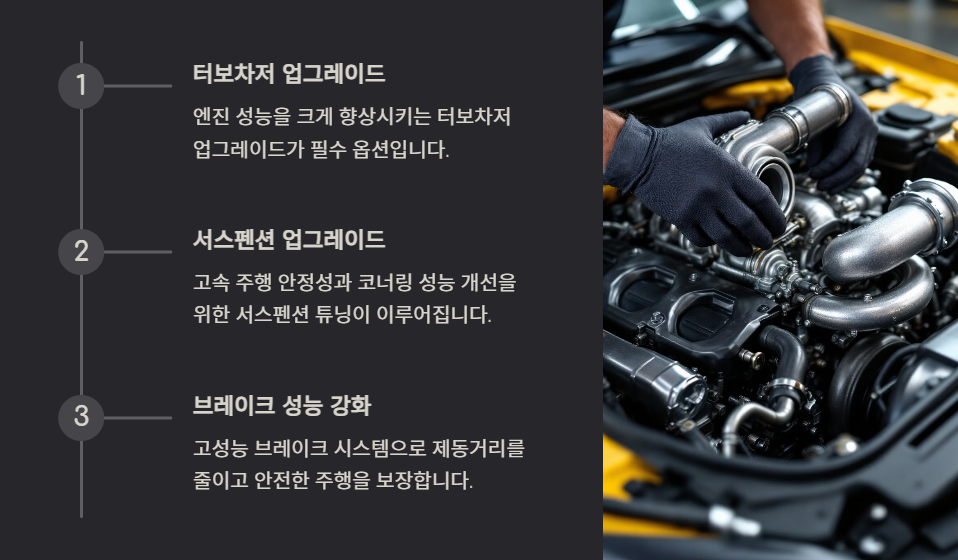 - 터보차저 및 슈퍼차저 업그레이드: 엔진 성능을 크게 향상시킬 수 있는 터보차저 및 슈퍼차저 업그레이드는 고성능 차량을 원하는 이들에게 필수적인 옵션입니다. 이를 통해 가속력을 크게 높일 수 있으며, 더욱 다이내믹한 주행 경험을 제공합니다.