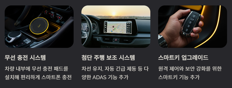 - 스마트키 업그레이드: 스마트키 기능을 추가하거나 기존 키 시스템을 업그레이드해 차량 접근성을 개선하는 것도 하나의 트렌드입니다. 이를 통해 원격으로 차량을 제어하거나, 보안을 강화할 수 있습니다.