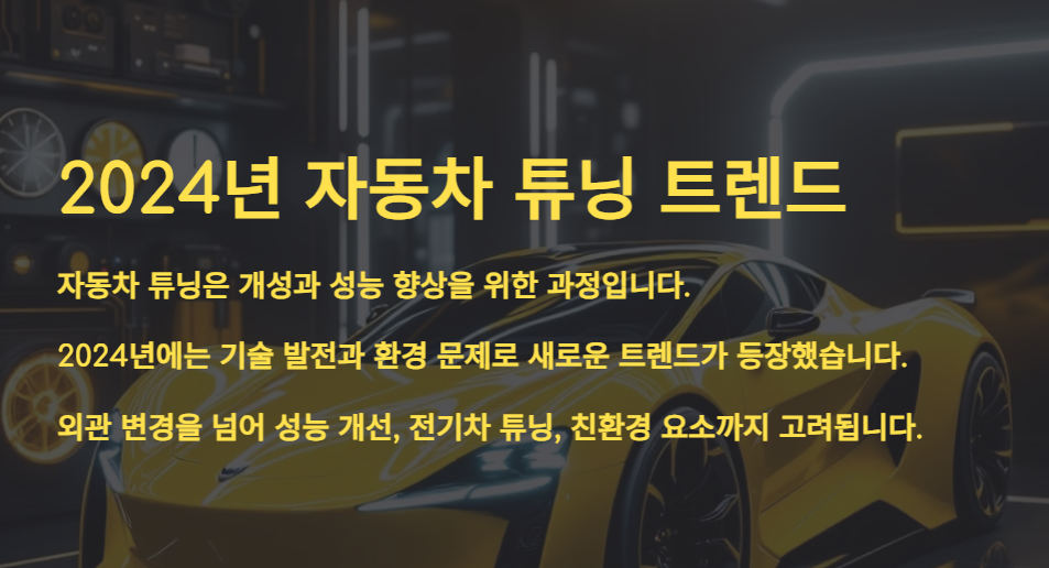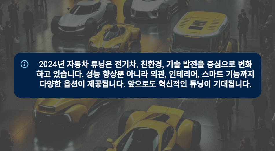 2024년 자동차 튜닝 트렌드는 전기차와 친환경적 요소, 그리고 기술적 발전을 중심으로 빠르게 변화하고 있습니다. 성능 향상뿐만 아니라, 외관과 인테리어, 스마트 기능까지 다양한 측면에서 차량을 개성 있게 꾸밀 수 있는 옵션이 많아지고 있습니다. 앞으로도 자동차 튜닝은 더 많은 혁신과 창의적인 아이디어를 통해 더욱 발전할 것으로 기대됩니다.