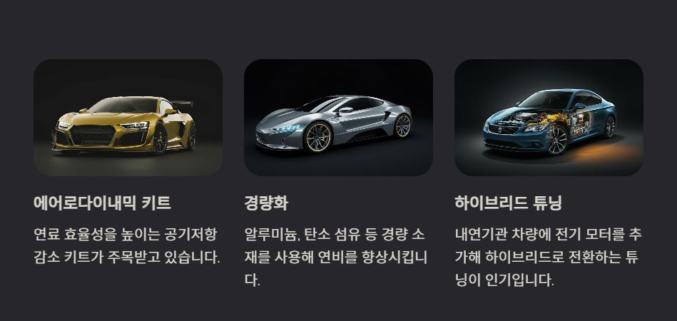 - 하이브리드 튜닝: 기존의 내연기관 차량에 전기 모터를 추가해 하이브리드 차량으로 전환하는 튜닝도 인기를 얻고 있습니다. 이를 통해 연료 사용을 줄이고, 이산화탄소 배출을 감소시키려는 움직임이 강해지고 있습니다.