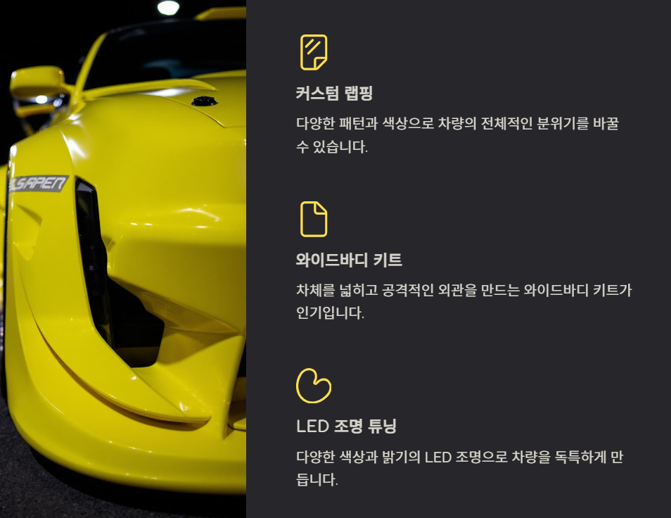 - 와이드바디 키트: 차량의 차체를 넓히고, 더욱 공격적인 외관을 만드는 와이드바디 키트는 여전히 인기를 끌고 있습니다. 이는 차량의 외형을 강렬하게 만들어주며, 퍼포먼스 면에서도 공기역학적 이점을 제공할 수 있습니다.