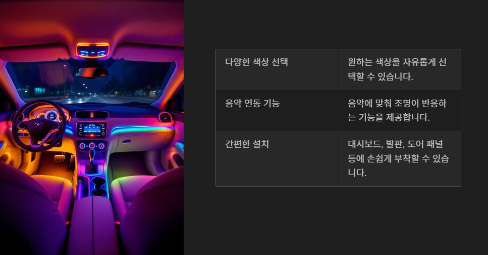 - 음악 연동 기능: 음악에 맞춰 조명이 반응하는 기능을 추가해, 차 안에서 즐기는 시간을 더욱 특별하게 만들어줍니다.