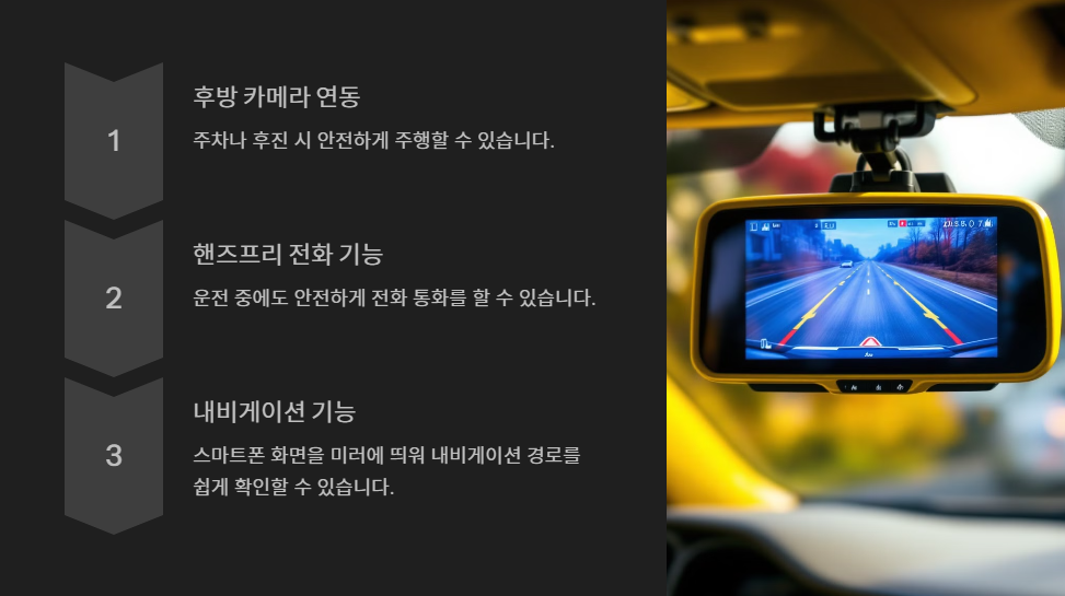 - 내비게이션 기능: 스마트폰 화면을 미러에 띄워 내비게이션 경로를 쉽게 확인할 수 있습니다.