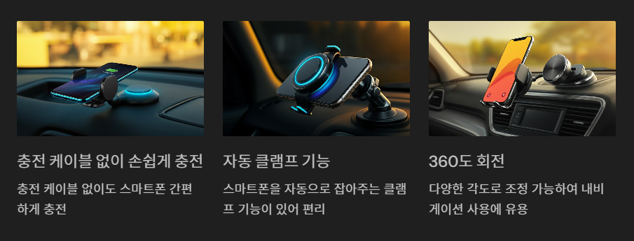 - 자동 클램프: 스마트폰을 가까이 가져가면 자동으로 잡아주는 클램프 기능이 있어, 운전 중에도 편리하게 스마트폰을 사용할 수 있습니다.