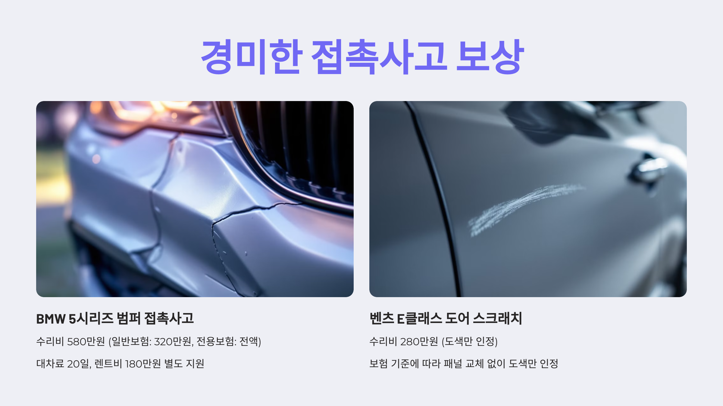 BMW 5시리즈 범퍼 접촉사고: 수리비 580만원, 일반보험은 320만원만 인정. 전용보험은 순정부품 사용으로 전액 보상. 대차료 20일, 렌트비 180만원 별도 지원.