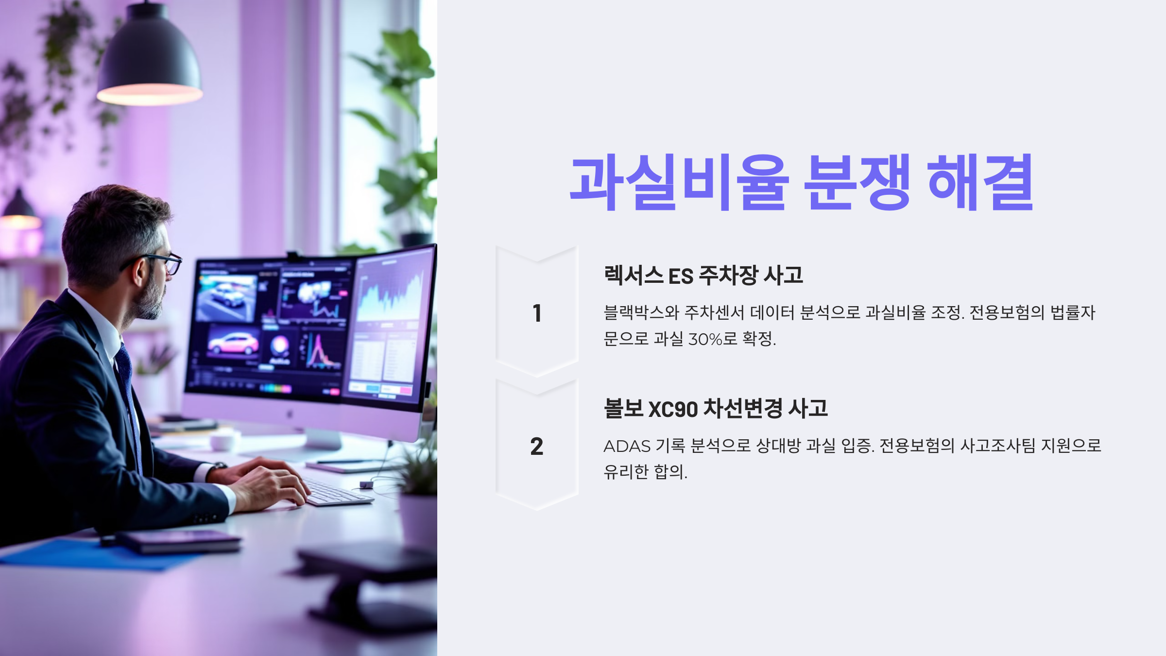 렉서스 ES 주차장 사고: 블랙박스와 주차센서 데이터 분석으로 과실비율 조정. 전용보험의 법률자문으로 과실 30%로 확정.