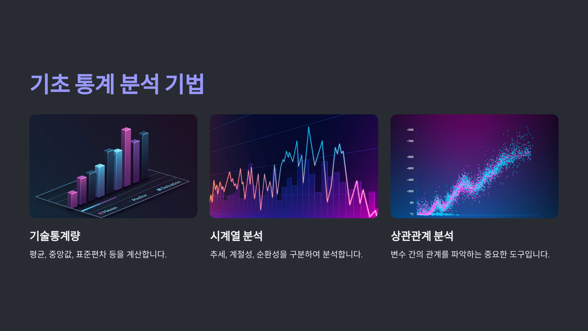 데이터 시각화는 분석 결과를 효과적으로 전달하는 핵심 도구입니다. 시계열 그래프, 산점도, 히트맵 등 다양한 차트를 활용합니다. 지도 기반 시각화는 공간적 패턴을 직관적으로 보여줍니다. 시각화 도구 선택은 데이터의 특성과 전달하고자 하는 메시지에 따라 달라집니다.
