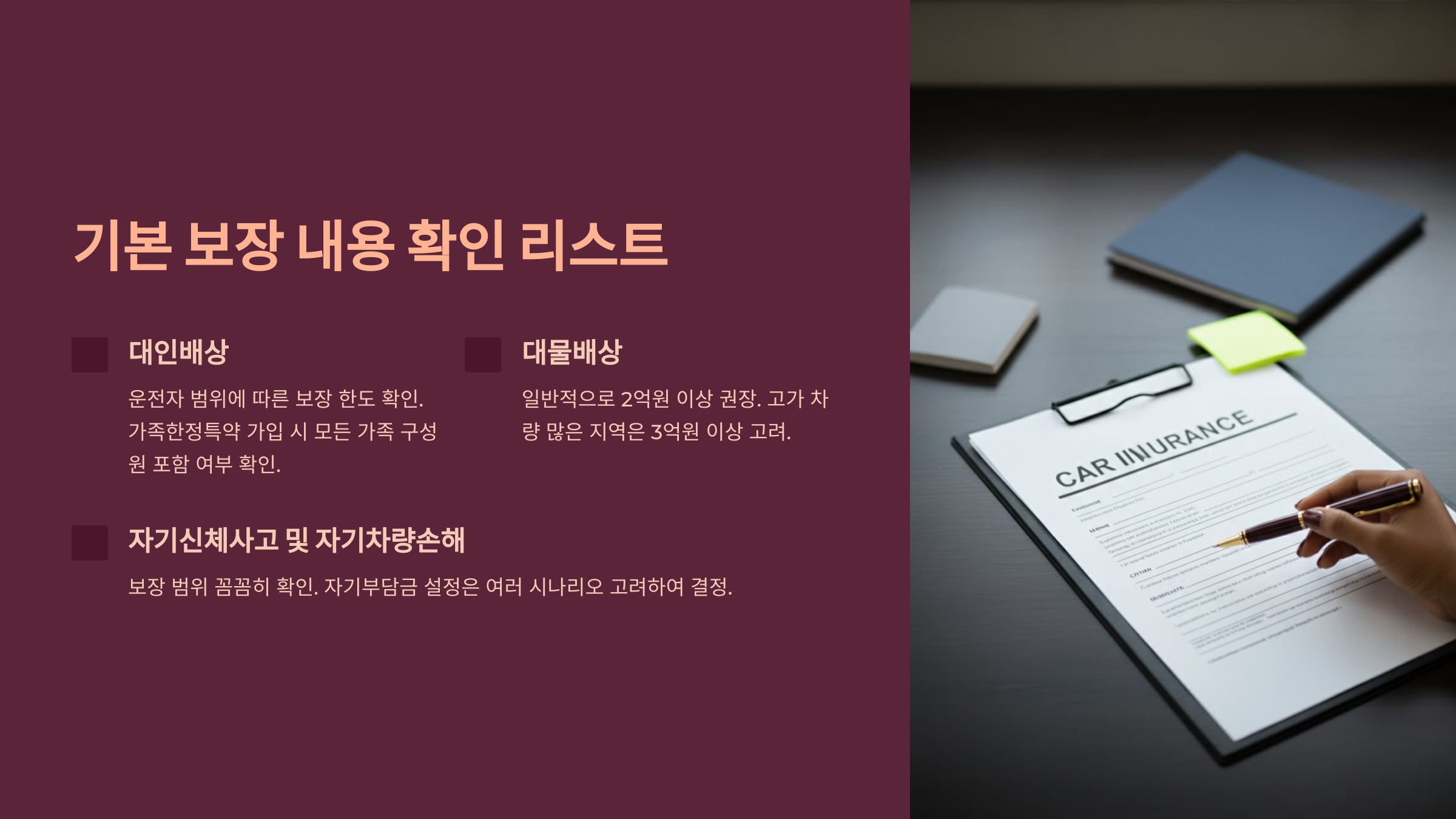 필수보장 항목의 정확한 확인이 가장 중요합니다. 대인배상의 경우 운전자 범위에 따른 보장 한도를 확인해야 합니다. 예를 들어, 가족한정특약에 가입했다면 실제 운전할 모든 가족 구성원이 보장 대상에 포함되어 있는지 확인해야 합니다. 대물배상은 일반적으로 2억원 이상을 권장하며, 고가 차량이 많은 지역에서는 3억원 이상도 고려해야 합니다.