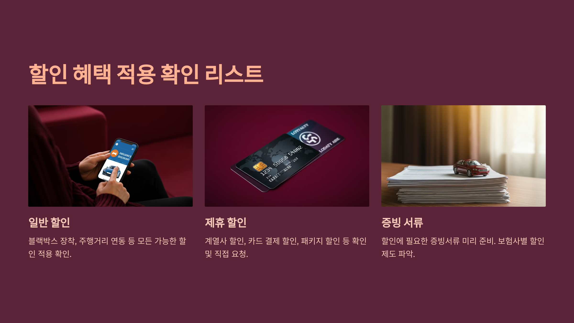 모든 가능한 할인이 적용되었는지 체크해야 합니다. 실제 사례를 보면, B씨는 블랙박스 장착 할인과 주행거리 연동 할인을 동시에 받아 연간 30만원의 보험료를 절감했습니다. 할인 항목 누락은 매우 흔한 실수이므로, 보험사별 할인 제도를 미리 파악하고 필요한 증빙서류를 준비해야 합니다.