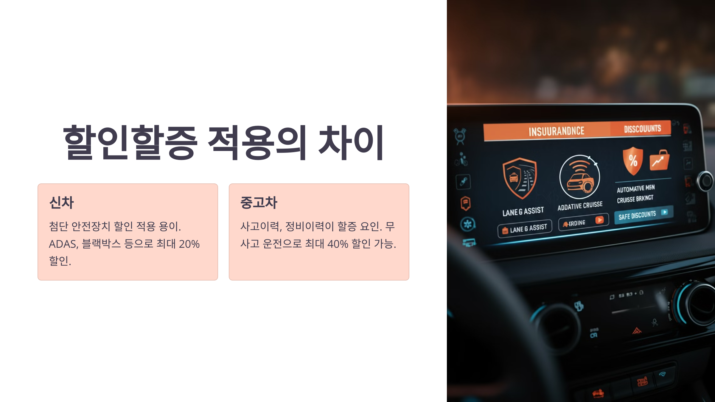 중고차는 기존의 사고이력과 정비이력이 할증 요인으로 작용할 수 있습니다. 특히 주요 부품 교체이력이 있는 경우 할증률이 높아질 수 있으며, 이전 소유자의 사고이력도 영향을 미칠 수 있습니다. 다만 중고차도 무사고 운전 경력이 쌓이면 최대 40%까지 할인을 받을 수 있어, 장기적으로는 보험료 절감이 가능합니다.